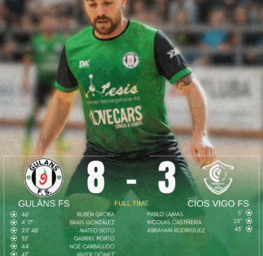 Sin categoría GULÁNS FS FIRMA UNA GOLEADA Y SE COLOCA SEGUNDO EN LA TABLA 11 de noviembre de 2025 El Guláns Fútbol Sala firmó una de sus victorias más sólidas de la temporada tras imponerse por 8-3 al Cios Vigo F.S. en el...